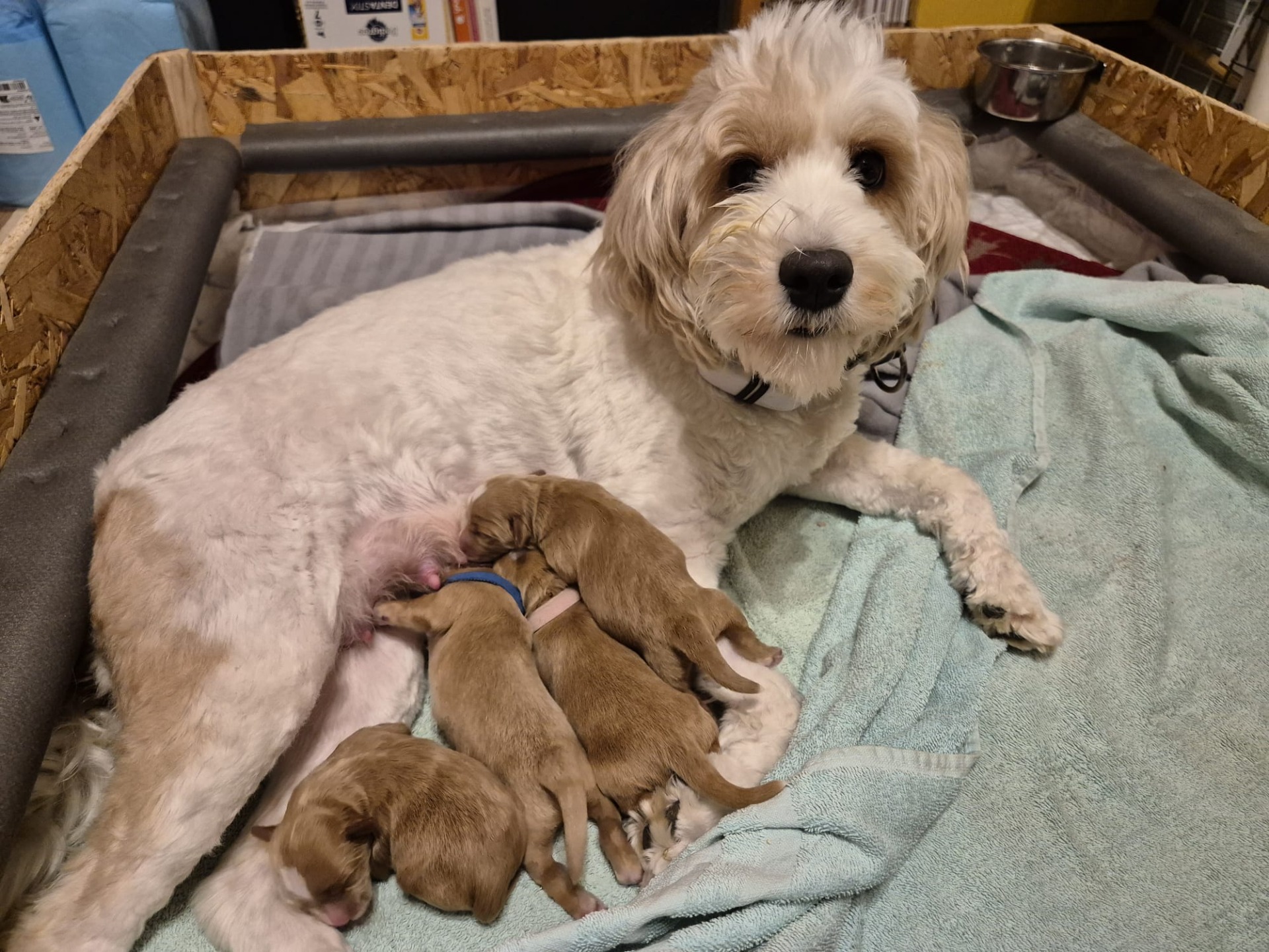Pentueeseen syntyi kaksi narttua ja kaksi urosta. Yksi uros vaaleampi kuin muut ja kaikilla valkoista mukana värityksessä. Yksi uros vapaana tästä pentueesta.